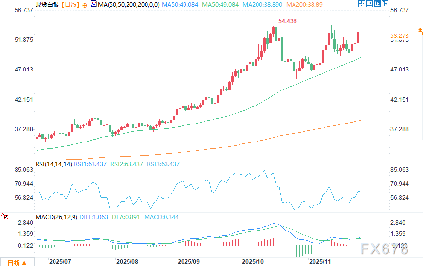 周四(11月27日)美盘时段,现货白银日内价格呈现“先回落、后冲高再震荡”的走势:亚市早盘小幅下探后,亚盘尾盘左右快速拉升至日内高点53.9附近,随后逐步回落并在53.2-53.3区间进入横盘震荡。
